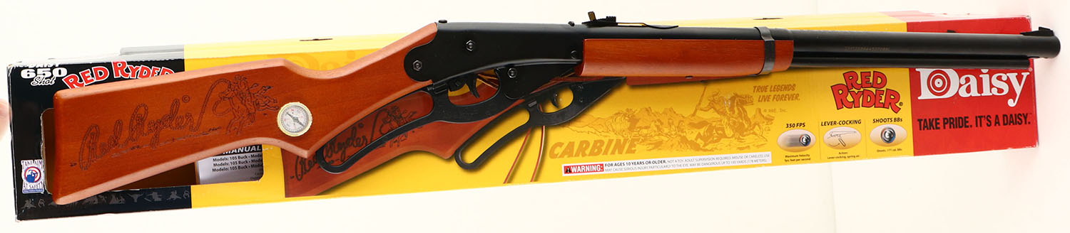 BOXES Daisy, Model RED RYDER CARBINE, .177 Caliber Pellet/BB Rifle, Single Lever, 650 shots, 350 FPS, 17 3/4'' Barrel, wood stock has engraved scene & compass, standard adjustable rear sight & front sight post, comes in original box with manual, NIB. Grade: MINT - Value: 10 to 60