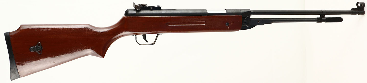 Pioneer, Made in China, .177 Pellet Rifle with lever under barred to pump. Firearms condition grades as follows: The wood stock is excellent with a few minor scratches. The metal is 70%. Adjustable rear sight & hooded front sight. The lever latch is broken so the lever will no stay attached to the barrel, This pellet rifle is believed to be in good operating condition. Grade: Very Good - Value: 10 to 40