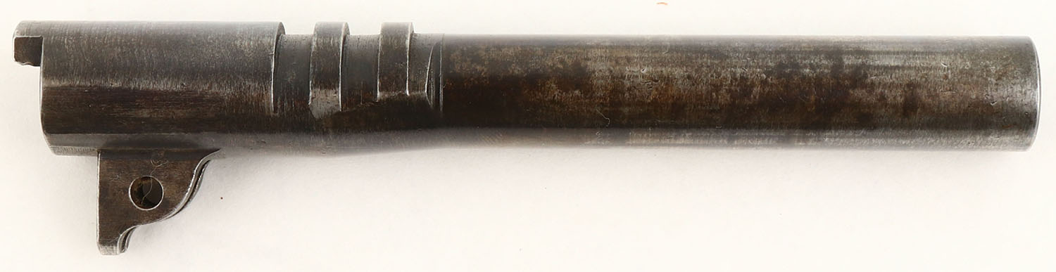 Colt 1911 45 ACP, Military Contract 5'' barrel. Top of barrel stamped ''P'' provisional proof, ''H'' for Frank Hosmer, who was stamping SN 110,001-133,187 & 137,401-425,000. Right side of barrel link is stamped ''C''. Bore is good, but with cleaned spotting in the grooves. - Value: 20 to 50