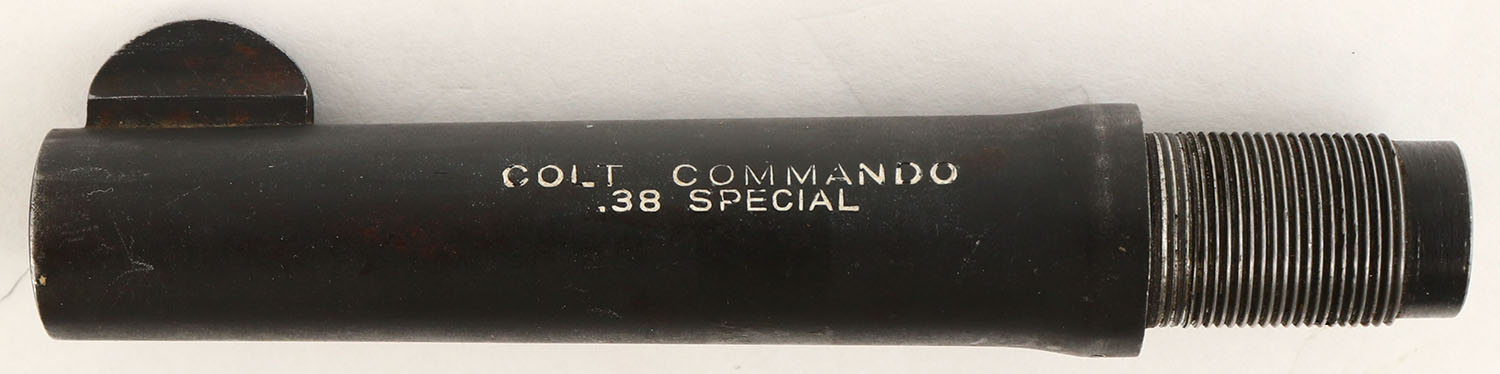 Colt Commando, .38 Special, 4'' barrel., black parkerized finish rates 80% with scratches & a spot of patina. The bore is very good. Its bright with thinned rifling. Grade: Very Good + - Value: 20 to 200