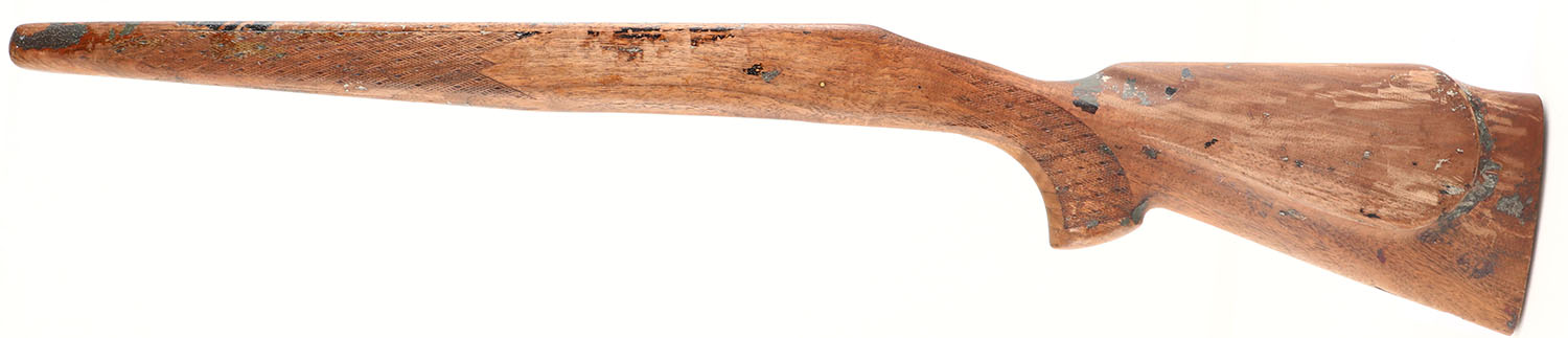 Remington Model 700 Monte Carlo Stock, Long Action, cheeked, skip-line checkered flat pistol grip, finish mostly removed, missing sling studs. Grade: Very Good - Value: 10 to 50