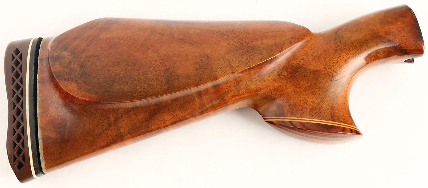 Remington Custom LEFT HAND stock for various rifle or shotgun model. Left side cheek & high comb. Rosewood capped pistol grip. Original finish is excellent, with some edge flaking at buttend. Fantastic grain. Stock has a ventilated Pachmayr recoil pad. Grade excellent. - Value: 20 to 150