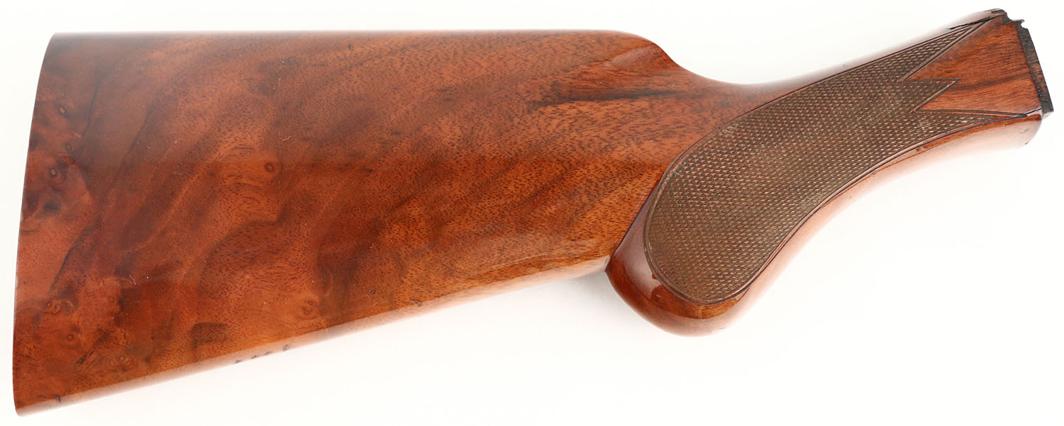 Browning unknown model take-off stock, Square attachment shape at receiver. Factory checkering remains excellent, round knob pistol grip, Factory high gloss finish, excellent rippled grain. Chip at top of wrist where meets receiver. Large cavity in buttend of stock. No buttplate. Grade very good. - Value: 10 to 30