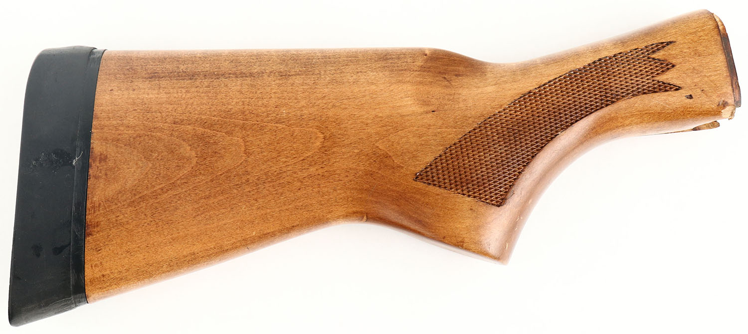 Remington model 870 light, 20 ga. take-off stock, Factory checkered & flat pistol grip. Factory finish, Very few blemishes. Glue repaired 1'' crack at left side of wrist. Stamped ''87L 20'' on receiver end. Cut short for junior hunter, with Remington solid recoil pad. Grade Good. - Value: 5 to 20