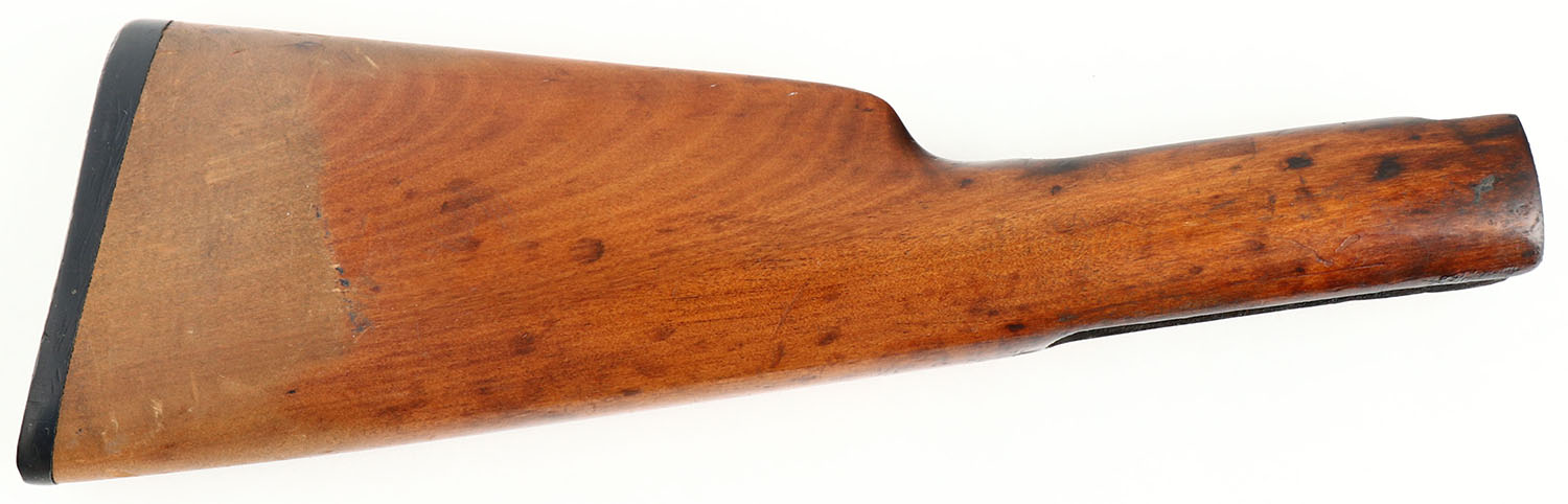 Winchester Model 1896 .22 pump rifle take-off gum wood stock. Shortened, but with original modified Winchester buttplate, with engraved screws. Original finish, but with lower half lightly sanded. Minor to small blemishes & contusions. Grade Good - Value: 10 to 25
