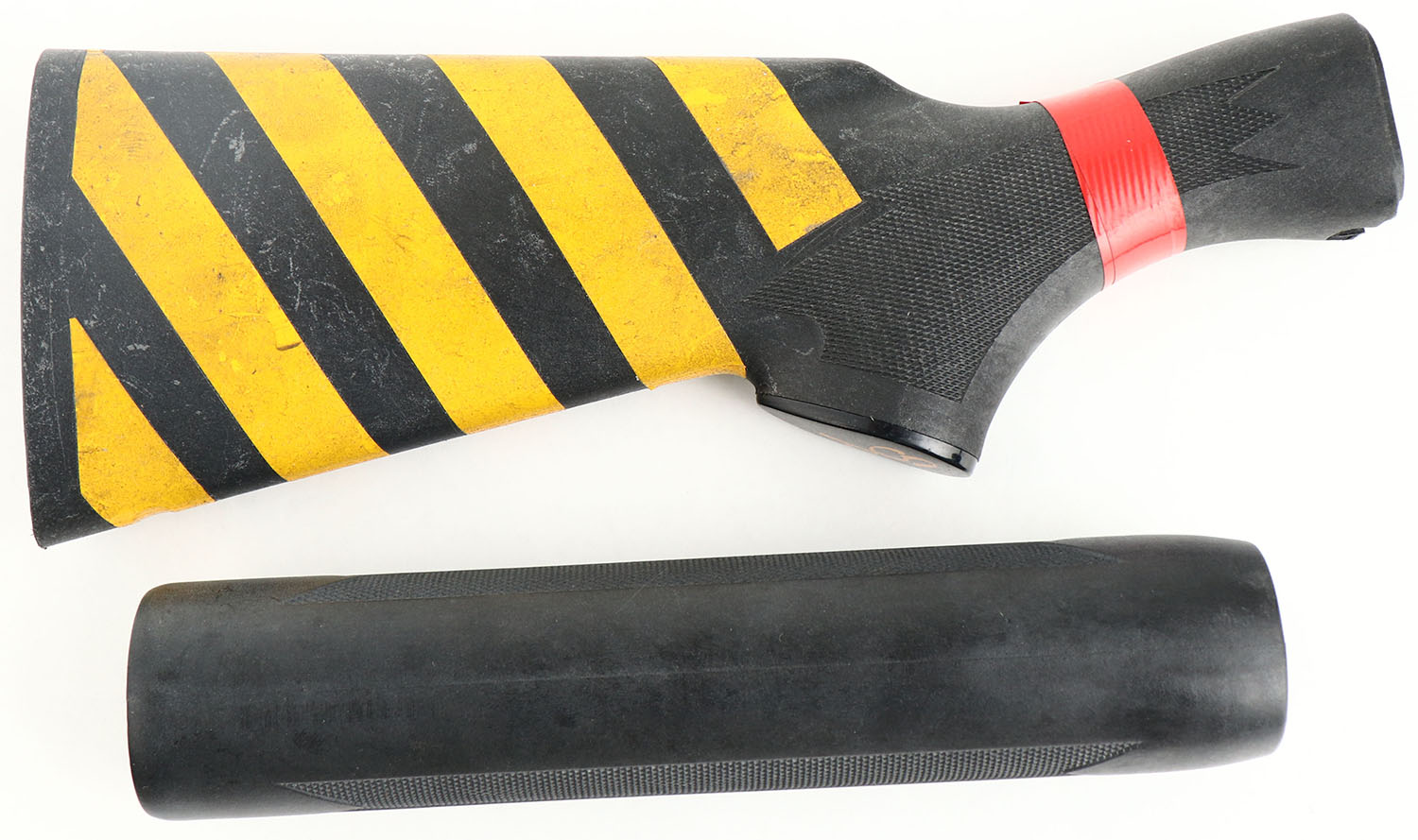 Remington Model 870 20 ga. shotgun take-off stock & forend set, Checkered & capped pistol grip synthetic stocks. Added tape stripes. Minor handling blemishes. No recoil pad or sling stud. Grade good. - Value: 10 to 40