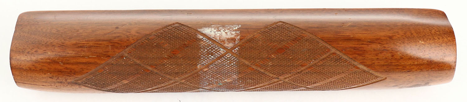 Remington Model 58 forend 12 ga. shotgun. Factory checkered walnut & factory finish. Minor handling blemishes & some tape residue. 2'' tight stress crack at belly of receiver end. Grade Very Good - Value: 10 to 40
