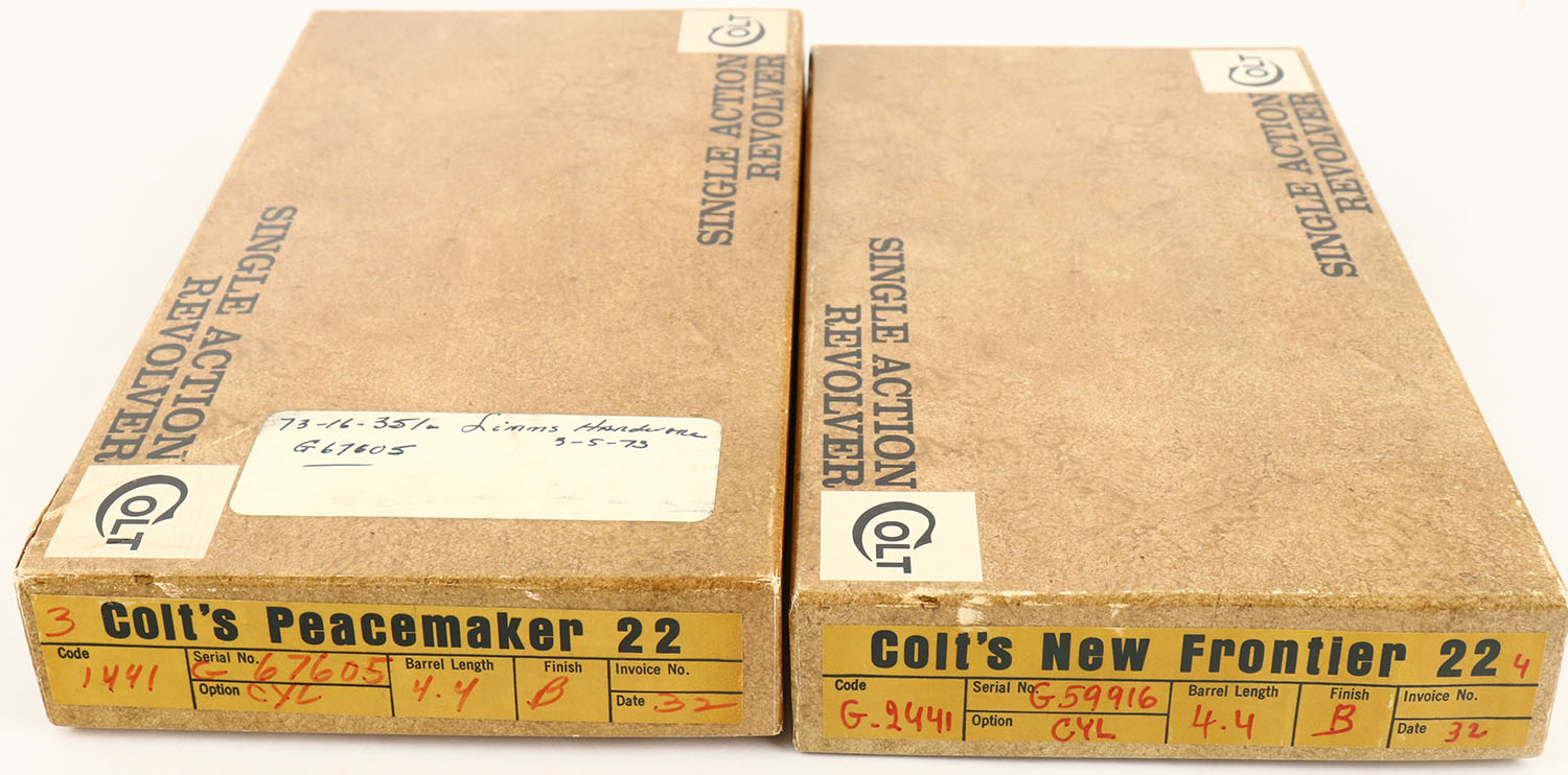 Lot of (2) Colt .22 Revolver boxes, (1) Colt's New Frontier 22, (1) Colt's Peacemaker 22, both boxes contain spare .22 Mag. Cylinders, boxes are solid with minty color, minor corner wear. Grade: Excellent + - Value: 20 to 100