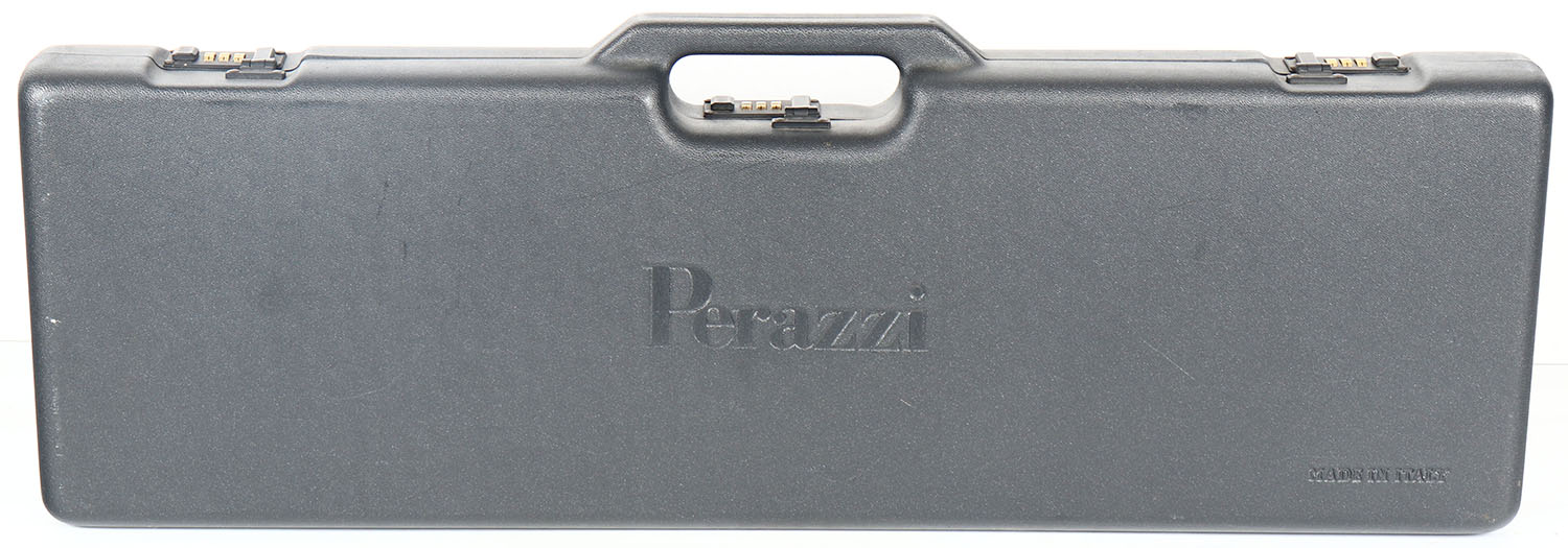 Perazzi, Factory plastic combo locking case for O/U shotgun, Blue padded cloth interior, Metal latches, Latches are stiff. Measures 32'' x 10'' x 3''. Grade: Excellent - Value: 20 to 100