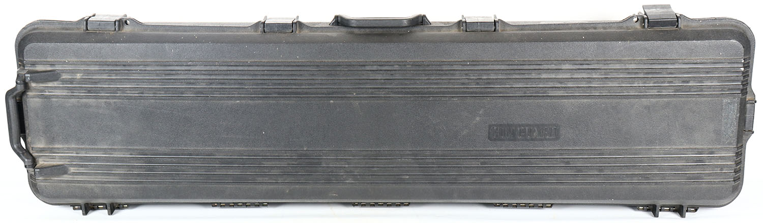 Gun Guard rolling black plastic gun case, egg carton foam interior, multiple plastic handles, measures 50'' x 12'' x 6''. Grade: Excellent - Value: 30 to 150