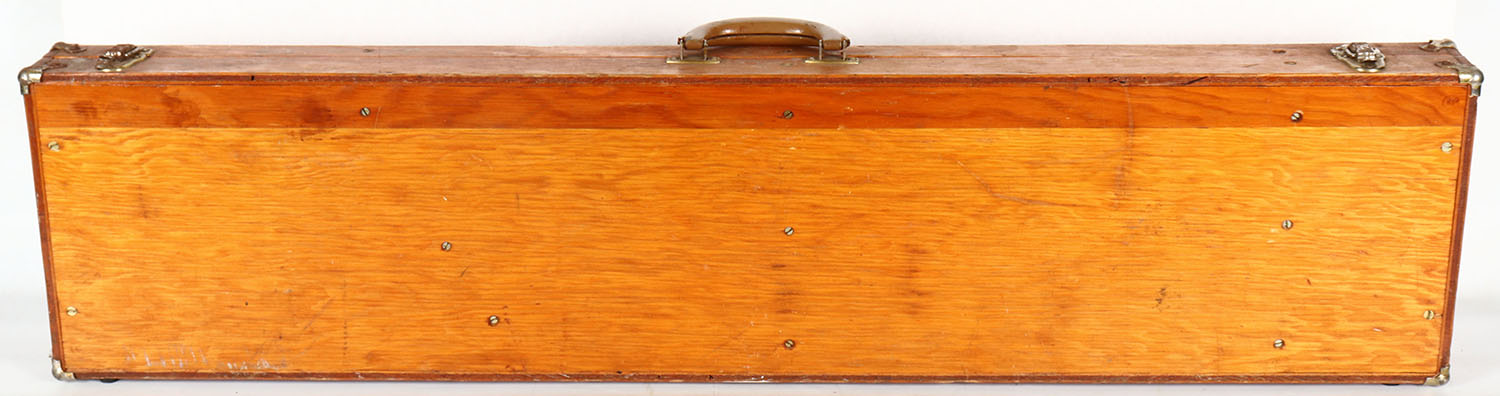 Homemade stained wood gun case, leather handle, brass latches, latches are corroded, vintage egg carton foam interior. measures 45'' x 10 1/2'' x 3 1/2'' Grade: Good - Value: 4 to 40