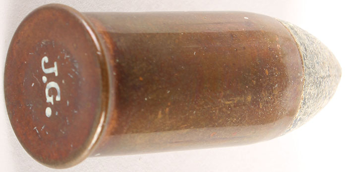 58 Rimfire Musket. HS:''J.G.'' impressed. PT Lead. Very Scarce in this caliber by this cartridge manufacturer. Grade: Very Good - Value: 200 to 400
