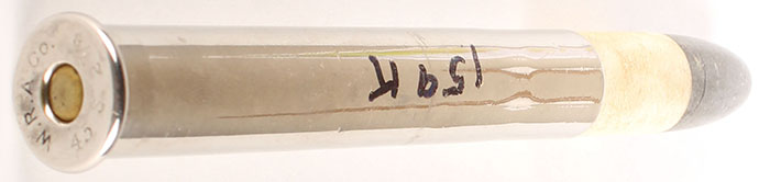.45 x 2.87'' Sharps. HS:''W.R.A.Co. 45 S. 27/8''. RN PP Lead. Nickeled Case. Grade: Very Good - Value: 30 to 60