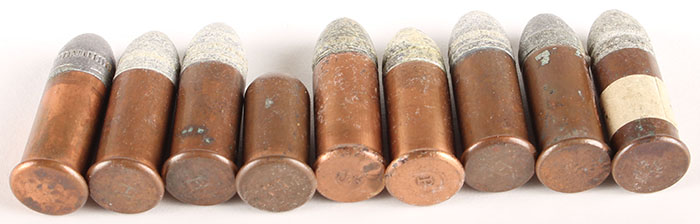 Lot of 9. 38 Short Rimfire. (4) HS:''H'' impressed, 4--RN Lead, 1--Blank. (1) HS:''US''raised, RN Lead. (1) HS:''P''raised, RN Lead. (1) HS:''US''impressed, RN Lead. (1) HS:''P''impressed, RN Lead. (1) HS: Grade: Very Good - Value: 20 to 40