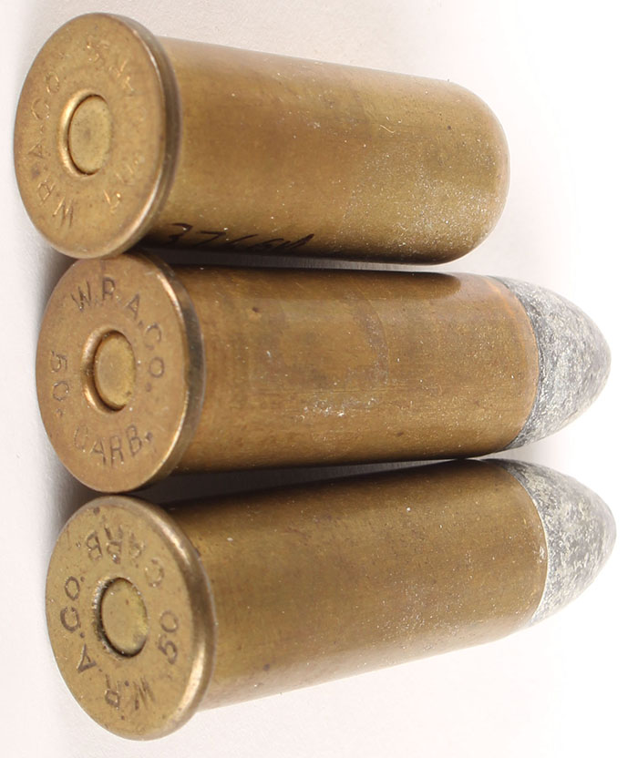 50 Carbine. HS:''W.R.A.Co. 50 CARB.'', (2) FN Lead. (1) Blank. Grade: Very Good - Value: 30 to 60