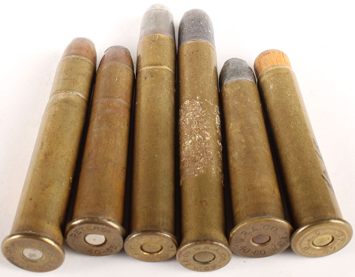 Lot of 6. (1) 40-82 Winchester, HS:''W.R.A.Co. 40-82 W.C.F.'', FN CJ SP. (2) 40-70 Winchester, HS:''W.RA.Co. 40-72 W.C.F.'', one has a RN Lead projectile and the other has a RN Tinned SN. (2) 40-65 Winchester, 1-- HS:''U.M.C. 40-65.'', Wood shot load, 1--HS:''PETERS 40-65'', FN CJ SP. (1) 40-60 Winchester, HS:''W.R.A.Co. 40-60 W.C.F., FN Lead. Grade: Very Good - Value: 30 to 60