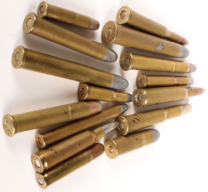 Lot of 15. US Sporting Cartridges. (2) 38-55 Winchester, both by Winchester. (1) each of the following: 22 High Power, 250-3000, 25-25 Stevens, 25-20 Winchester, 25-20 Stevens, 250 High Power, 32 Winchester, 303 Savage, 351 Winchester Self Loader, 32-40 Winchester, 38-40 Winchester, 38-70 Winchester, 38-72 Winchester. Grade: Very Good - Value: 20 to 40
