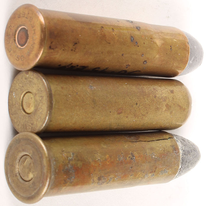Lot of 3. (1) 50-70 Govt--1.76'' case, NHS, FN Lead. (1) 50-95 Winchester, HS:''ELEY 50. WINCHESTER'', FN Lead with copper express tube. (1) 50-95 Winchester Shot, HS:''W.R.A.Co. 50-95 EXP'', Wad at casemouth. Grade: Very Good - Value: 30 to 50