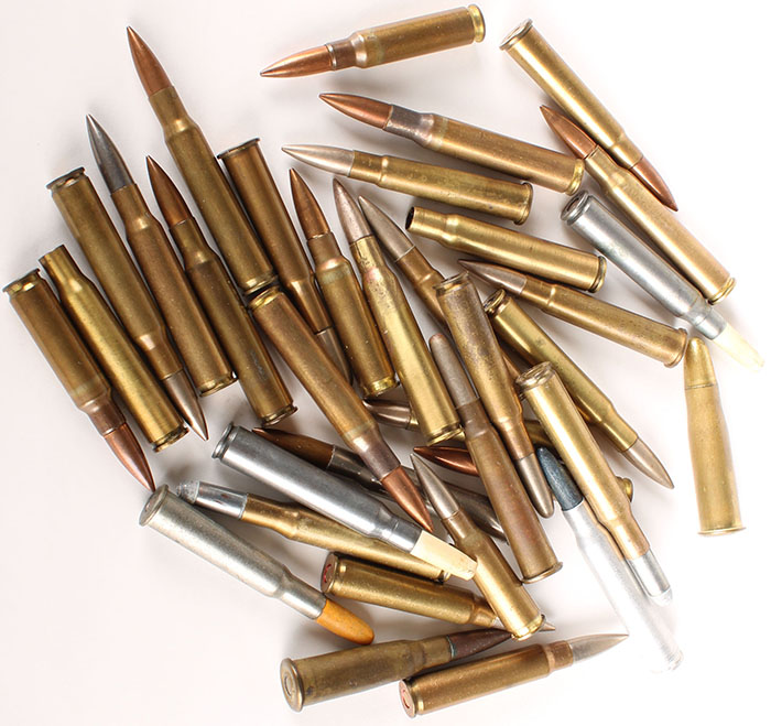 Lot of 35 military caliber cartridges, (17) .30-06, (2) 30-40 Krag, (4) .30 Pre NATO by Frankford Arsenal. (1) 7mm Assault (HS:''7MM 52 FN''). (1) 8mm Lebel Rifle from WW I. (6) .303 British including 1 commercial round and one RN CN FMJ with Maxim headstamp. (1) 10.4mm Italian Veterli Rifle with HS:''G.D * C-91''. (2) 7.65mm Mauser Rifle by Hirtenberg. (1) 7mm Mauser with HS:''DWM 1913''. See Photo. Excellent - Value: 20 to 40