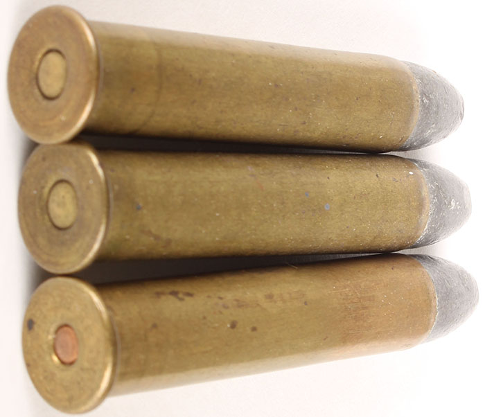 Lot of 3. 45-85 Bullard (2.1'' case). (2) NHS by Winchester, FN Lead. (1) HS:''W.R.A. Co. 45-85 BUL.'' FN Lead. Grade: Very Good - Value: 20 to 80