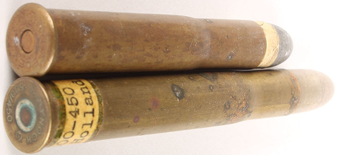 Lot of 2. (1) 500/450 Magnum Nitro Express (3.25'' case), KYNOCH C 500/450 C'', RN CN FMJ. (1) 577/450 #1 Express, HS:''ELEY No1 EXPS'', RN PP Lead with copper tube. Grade: Very Good - Value: 30 to 60