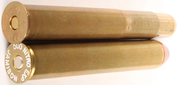 Lot of 2. British Big Game Cartridges. (1) 500 Nitro (3'' case), HS:''500 NITRO EXP JAMISON'', FN CJ SP. (1) 476 Westley Richards, HS:''476 WR kangaroo BB kangaroo'', RN Brass Jacket FMJ. Grade: Very Good - Value: 20 to 40