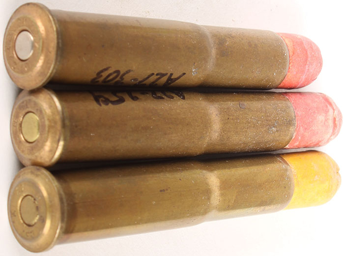 Lot of 3. .43 Mauser. Shot Loads. HS:''D.C.Co. 43 M'', (2) Red paper sabot, (1) tan or yellowish paper sabot. Grade: Very Good - Value: 30 to 60