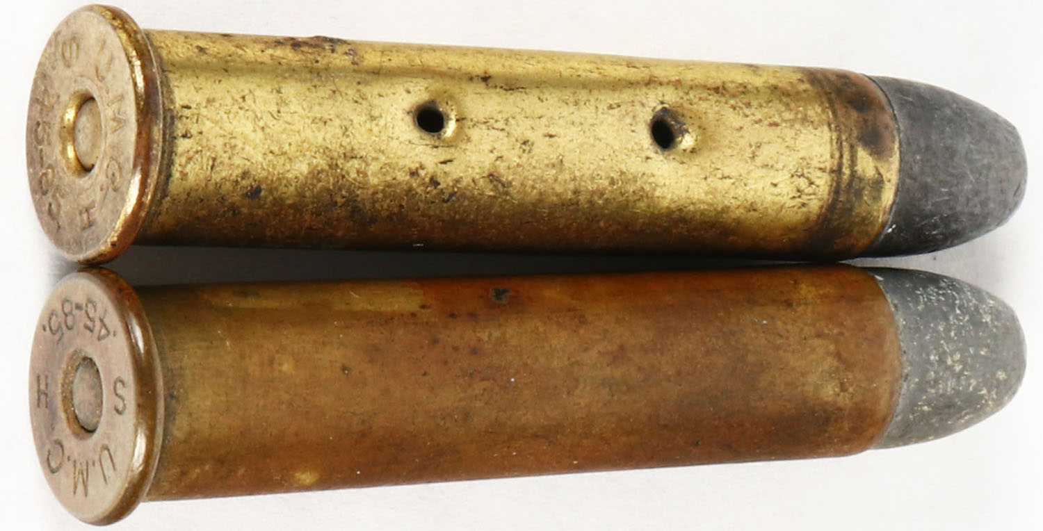 Lot of 2. 45-85 Bullard. (1) HS:''U.M.C. H .45-85 S'', FN Lead. (1) HS:''U.M.C. H .45-85 S''. FN Lead, BOARD DUMMY w/ two mounting holes. Grade: Very Good - Value: 30 to 120