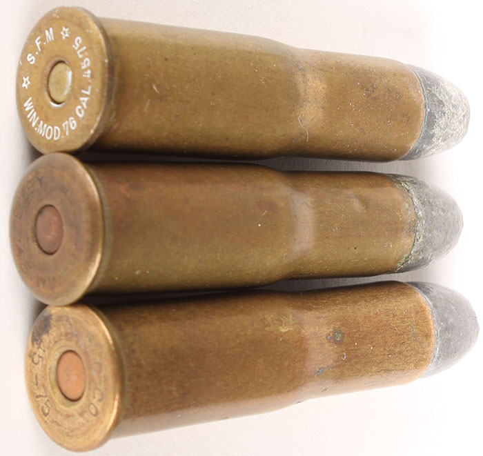 Lot of 3. 45-75 Winchester. (1) HS:''D.C.CO. 45-75'', FN Lead with copper primer. (1) HS:''ELEY 45 WINCHESTER'', FN Lead. (1) HS:''SFM * WIN. MOD. 76 CAL. 45-75'', FN Lead. Grade: Very Good - Value: 20 to 80