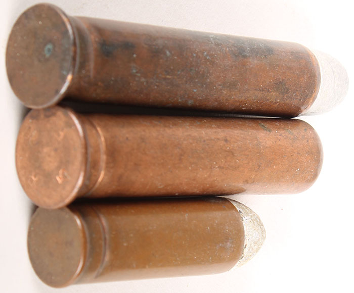 Lot of 3. Early US Military Rounds, all Benet primed copper cases. (1) 45-55 Govt., NHS. 405 gr RN bullet. (1) .45 Govt Blank. HS:''R 80 F 5''. (1) .45 Colt. NHS, FN Lead. Grade: Very Good - Value: 10 to 30