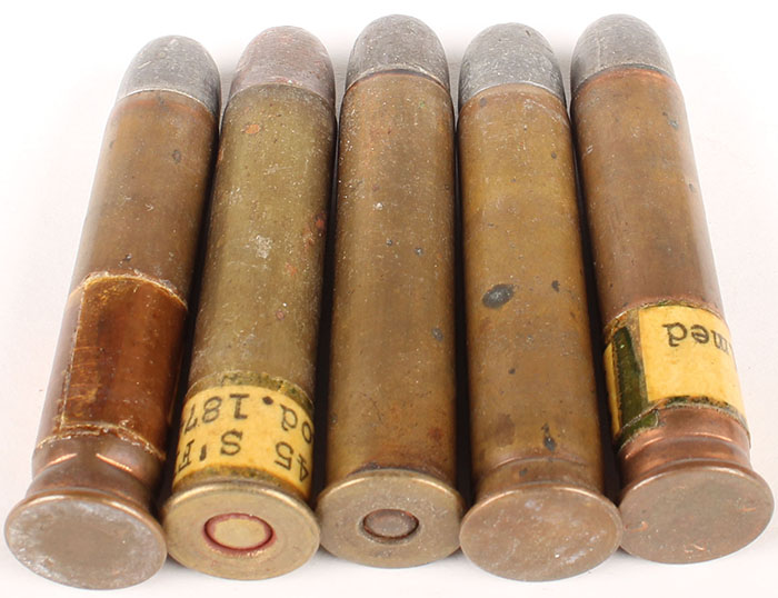 Lot of 5. 45-70 Springfield. (3) Benet Primed, All with 405 grain bullets, 1--HS:''R 82 F 5'', 1--HS:''C 78 F 12'', 1--NHS. (2) NHS, RN Lead. Grade: Very Good - Value: 30 to 60