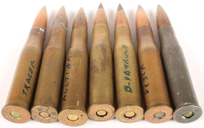 Lot of 7. 8x56m Mannlicher (Solothurn) Mdl 1930. Hungarian specialty Loads consisting of: (2) Tracers w/ green tips, (2) Gallery loads, (2) B-Patronen w/ black tips, (1) Armor Piercing w/ blue tip. Some paint loss on the tracers and AP rounds. Grade: Very Good - Value: 20 to 40