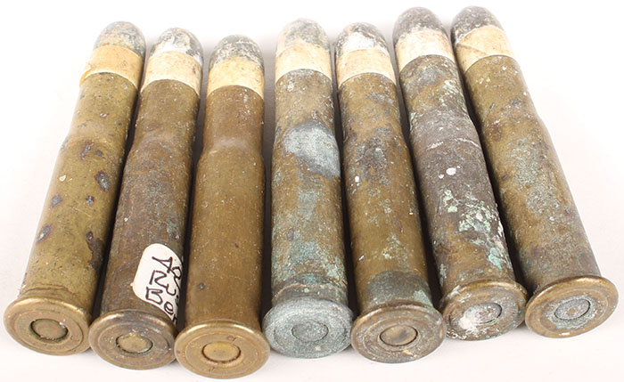Lot of 7. 10.6mm Russian Berdan. Various military headstamps. RN PP Lead. Dirty. Grade: Good ++ - - Value: 10 to 20