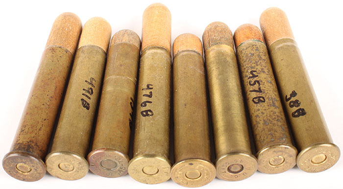 Lot of 8. 45-70 Govt Shot Loads. All with wood sabot of varying lengths. (5) HS:''U.M.C. H 45-70 S''. (2) UMC 45 GOVT. (1) REM-UMC 45 GOVT''. Grade: Very Good - Value: 20 to 80