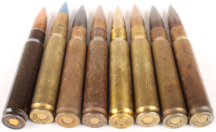 Lot of 8. 8x59mm Breda MG. Military loadings from SMI, BPD, and Capua--5 brass (one with blue tip) and two steel cases. See Photo. Grade: Very Good - Value: 20 to 40