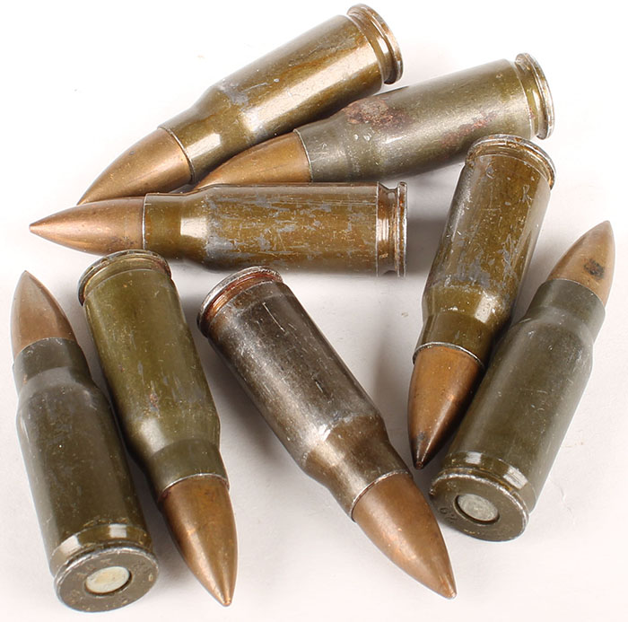 Lot of 8. 7.9mm Kruz. (1) HS:''hla St 3 44'',. (2) HS:''aux -- St 39 44'', (1) HS:''aux -- St 37 44'', (2) HS:''aux 7.9 9 43, (1) HS:''aux 7.9 6 43, (1) HS:''aux 7.9 6 43.. All are PT CJ FMJ ''SmE'', with blue annulus. - Value: 20 to 40