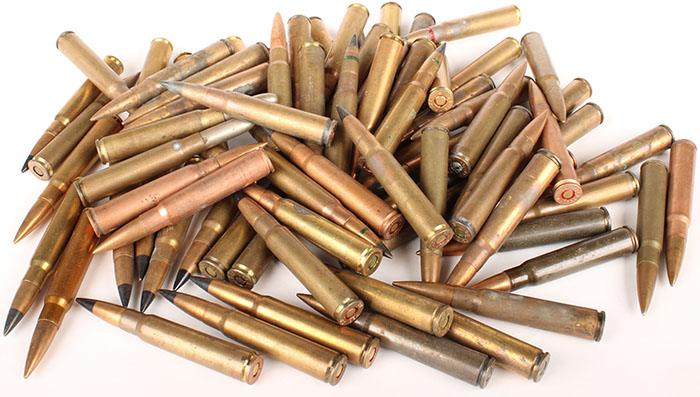 Lot of 78. 7.9x57mm Mauser. All with German made Brass Case. (35) Ball or AP. (20) SmK Lspur. (4) Sm K Lspur-V. (1) SmK Lspur Tropen. (1) Post War Danish Blank using German case. (8) Copper wash steel cases with metal codes. (8) rounds pre 1919 production. Grade: Very Good - Value: 50 to 100