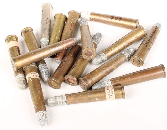 Lot of 16. 8.15x46mm Rimmed. A collection consisting of various headstamps and loadings. See Photo. Grade: Very Good - Value: 60 to 160