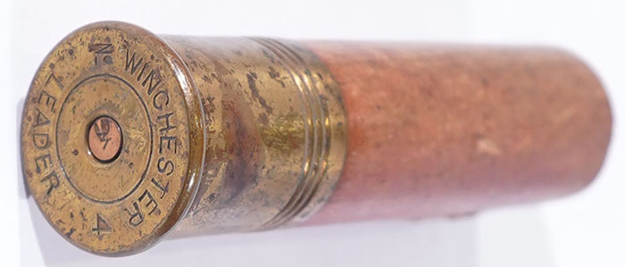 Winchester No. 4 Leader, 4ga, NPE red paper shot shell, 4'' OAL, shell shows wear & fading to paper with a dent in brass case. Grade: Good - Value: 6 to 40