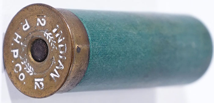 Robin Hood No. 12 R.H.P. Co. with CCW arrows around primer, loaded green paper case, TW: INDIAN 3 1 1/8 10 R.H.P.Co. solid shell. Grade: Very Good ++ - Value: 10 to 50