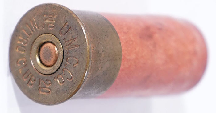 UMC No 20 NITRO CLUB, loaded red paper shot shell, TW 18 INFALLIBLE 3/4c 7 1/2 UMC, shell is little swollen. Grade: Very Good - Value: 6 to 30