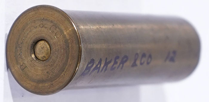 Rare Baker & Co. Brass shell, 12ga, loaded with tan top wad that is slightly pushed in. Grade: Excellent - Value: 10 to 80