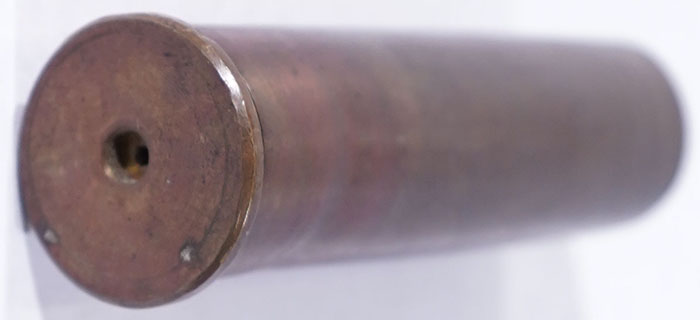 Unmarked heavy brass shot shell, 8ga, 3 7/8''. Grade: Very Good - Value: 6 to 30