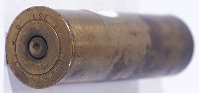 NPE, HS: USE BERDAN PRIMER 10A, brass case, dented primer, shows some discoloring near mouth. Grade: Very Good - Value: 4 to 40
