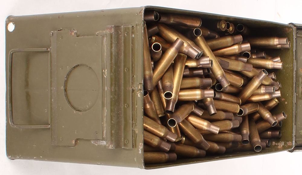 M2A1, .50 Cal metal ammo can, filled with Approx. 1000 once fired cases of .30-06, military surplus. Cases are very good, Grade: Excellent - Value: 100 to 300