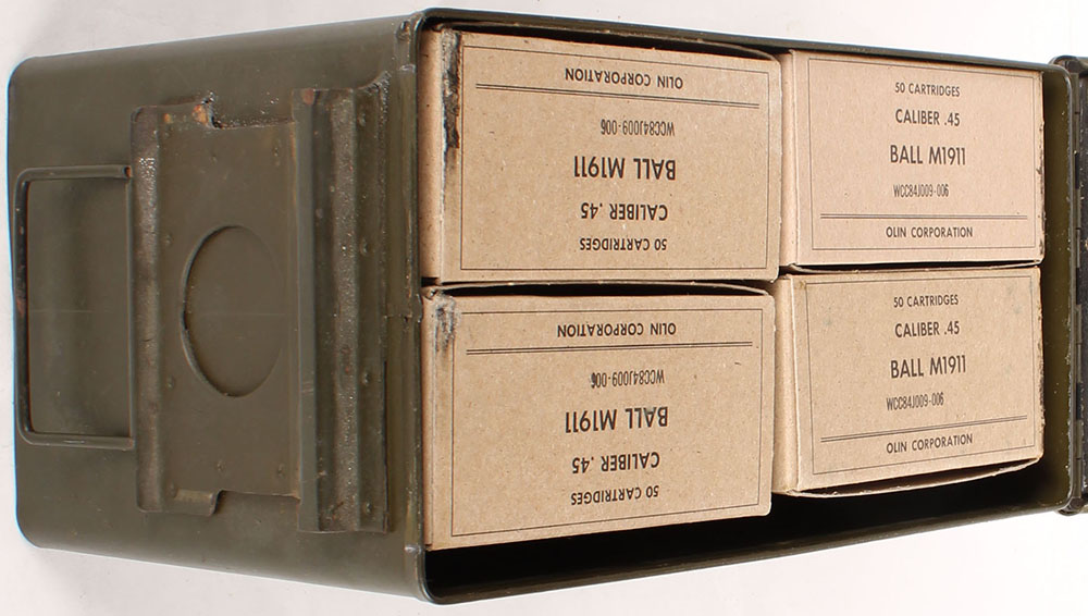 US, M2A1, .50 Cal ammo can filled with 1000 Rds. Of surplus Olin .45 ACP, in 50 Rd. boxes, ammo dated 1984, ammo is excellent. Grade: Excellent + - Value: 400 to 600