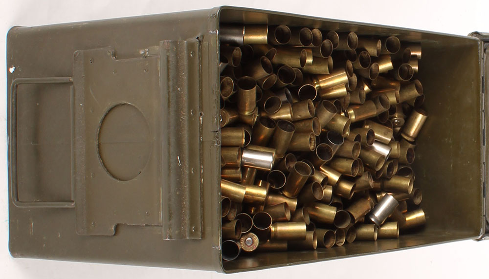 S, M2A1, .50 Cal ammo can, filled with approx. 1000 Rds. of .45 ACP, once fired PRIMED brass. Cases are very good to excellent. Grade: Very Good ++ - Value: 50 to 200