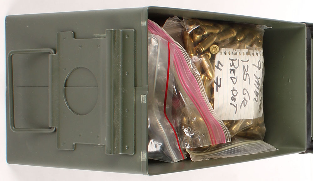 US, M2A1 .50 Cal ammo can, filled with Approx 1100 Rds. Of 9mm, 40 Rds. Of factory Armscore ammo, the rest are all handloads/reloads, mix of bullet weight & type, ammo is excellent. Grade: Excellent + - Value: 150 to 450