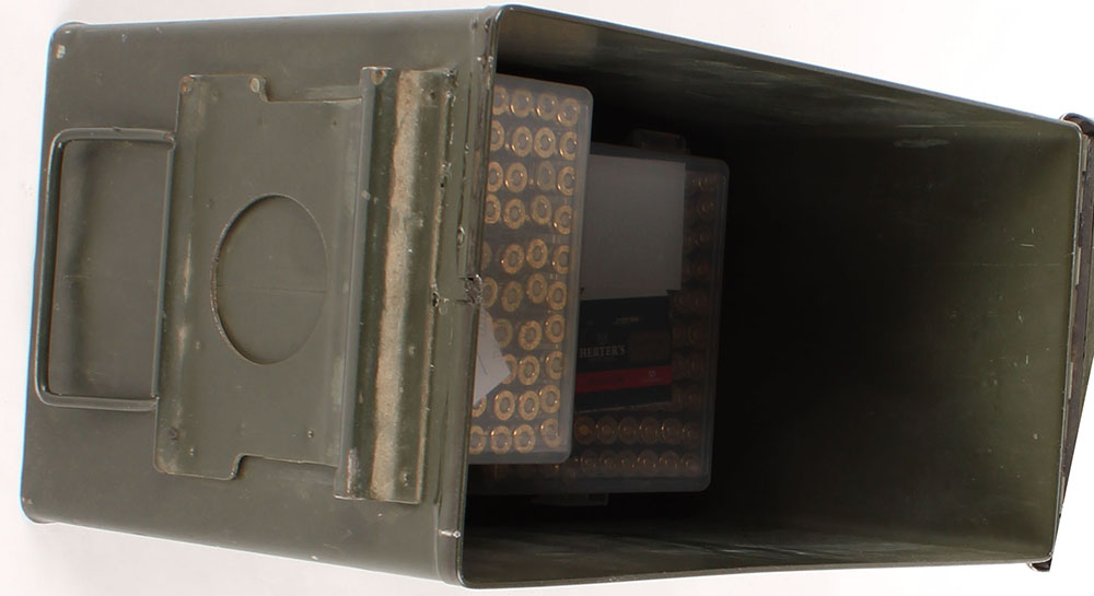 US, M2A1, .50 Cal ammo can, filled with 300 Rds. Of 9mm handloads/reloads, all FMJ, mix bullet weight, ammo is excellent. Grade: Excellent + - Value: 50 to 150