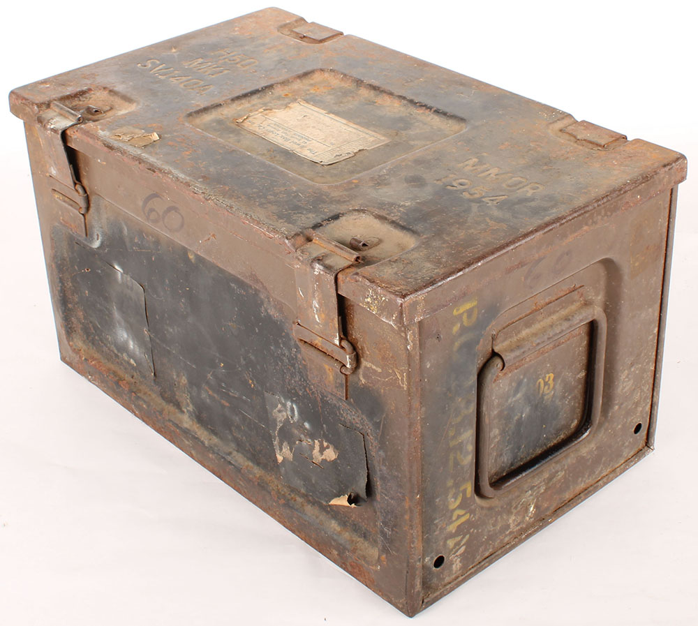 British, H50 MK1 steel ammo box, 1954 dated, empty, inside has rust. Grade: Very Good - Value: 10 to 30